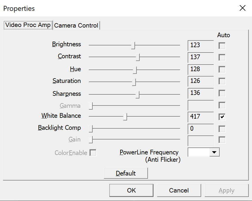 I took the picture below on my son's laptop. As you can see, the settings are weird, at best. I figured the problem was not on my machine, but on the camera itself.
