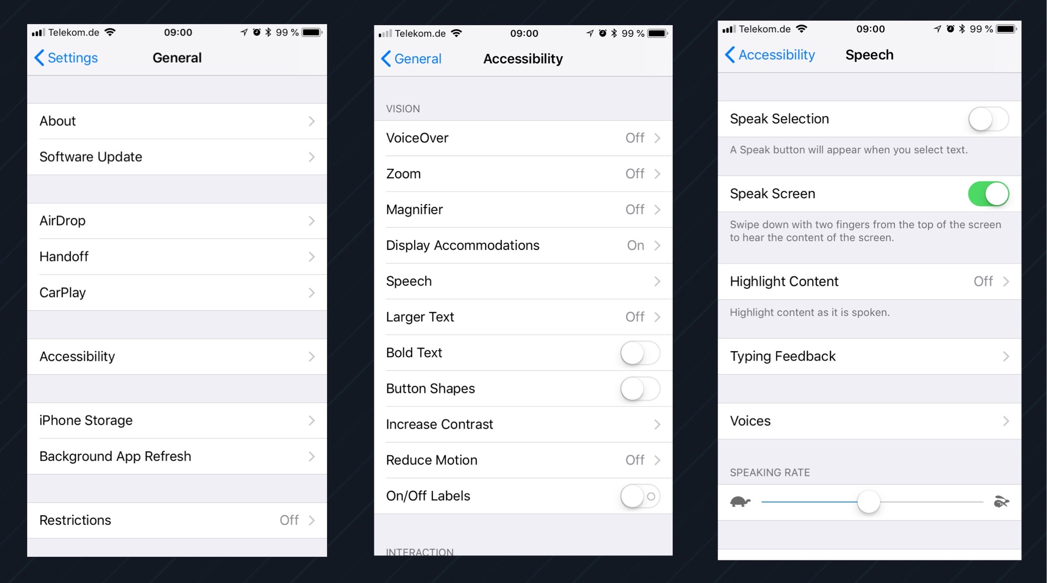 Go to Settings > Accessibility > Speech > Speak Screen: