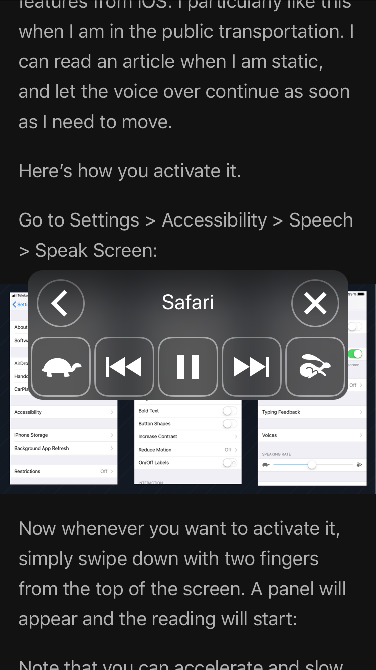 I’ve searched for such a feature for a very long time, and only recently discovered it is part of the accessibility features from iOS. I particularly like this when I am in the public transportation. I can read an article when I am static, and let the voice over continue as soon as I need to move.